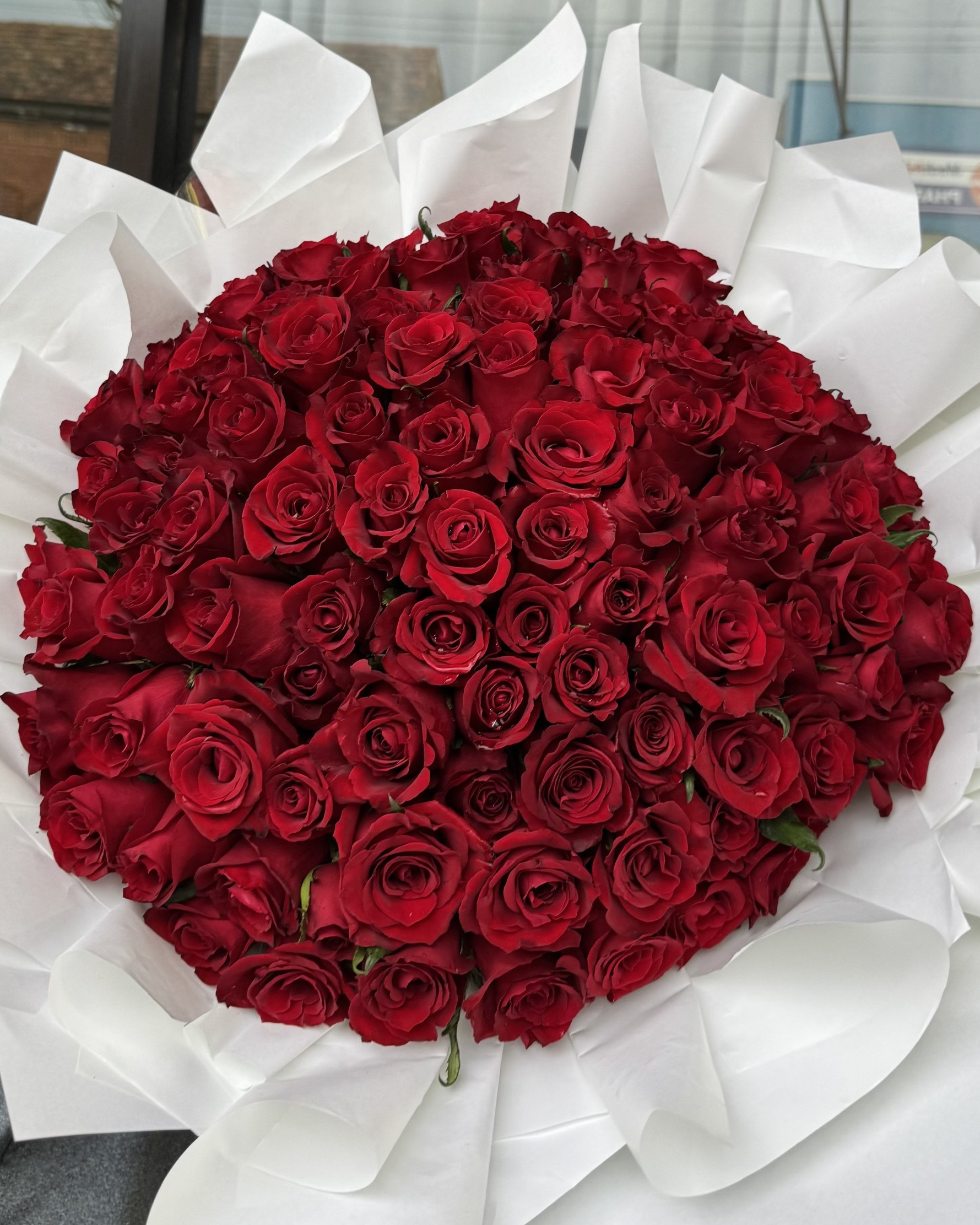 Love Beyond Words Bouquet is a breathtaking celebration of devotion, featuring one hundred exquisite red roses gathered into a bold and unforgettable display. Designed to command attention and stir emotion, this statement bouquet embodies passion, commitment, and love without limits. Elegantly wrapped and artfully arranged, it’s a powerful Valentine’s gesture created for moments when only the grandest expression will do.