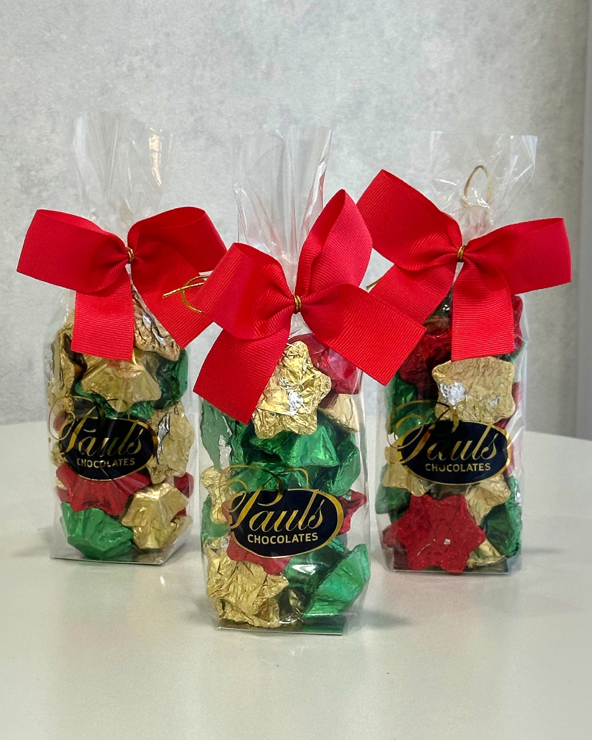 Add a touch of festive sweetness with this charming bag of creamy milk chocolate stars. Wrapped in sparkling red, green, and gold foil and finished with a bright red bow, this delightful treat is perfect as an add-on gift, stocking filler, or a little holiday indulgence. A simple, delicious way to share Christmas cheer.