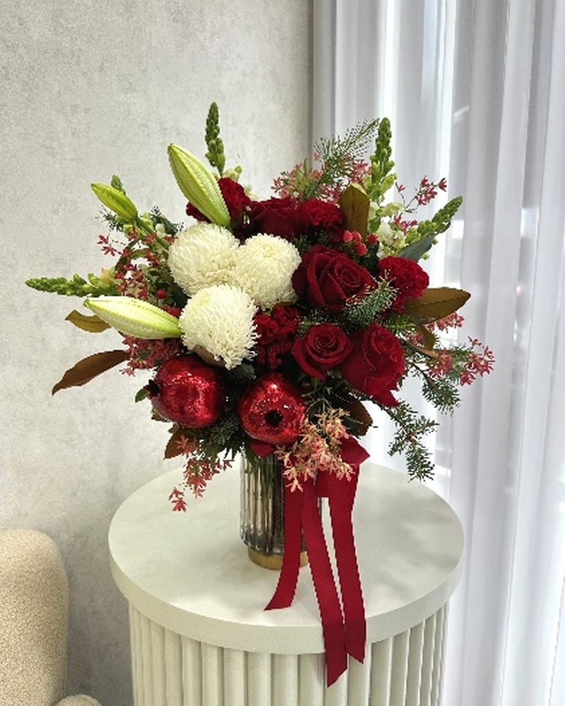 Very Merry Moments Vase Arrangement captures the warmth and joy of Christmas celebrations. Featuring rich red roses, lush white disbud chrysanthemums, elegant lilies, Christmas bush and seasonal festive foliage, this striking arrangement is accented with decorative pomegranates and finished with a flowing red ribbon. Styled in a classic glass vase, it’s the perfect centrepiece for creating unforgettable holiday moments, whether at home or gifted to someone special.